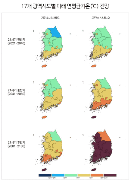 광역지자체별로 보면 '온실가스를 현재와 비슷하게 배출하는 경우'(SSP5-8.5·고탄소시나리오) 연평균 기온은 금세기말에 17.0~21.9℃로 현재(10.5~16.1도)보다 약 6도 높아진다. 연평균 기온 상승폭이 가장 큰 지자체는 서울과 경기로 6.7℃였다.