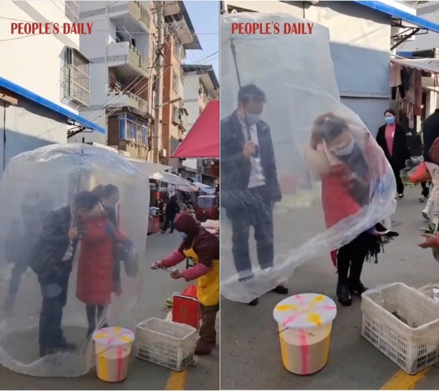 중국 인민일보는 한 커플이 발끝까지 가리는 '대형 비닐우산'을 쓰고 야채 시장에서 장을 보는 모습을 담은 영상을 지난 23일 공식 소셜미디어(SNS)에 공개했다. 영상과 함께 "한 중국인 커플이 개인 방역을 또 다른 차원으로 끌어올렸다"는 문구를 적었다.