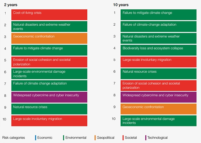 1위부터 순서대로 '기후변화 완화 실패'(Failure to mitigate climate change), '기후변화 적응 실패'(Failure of climate change adaptation), '자연재해와 극단적 기상현상'(Natural disasters and extreme weather events), '생물다양성 손실과 생태계 붕괴'(Biodiversity loss and ecosystem collapse)다.