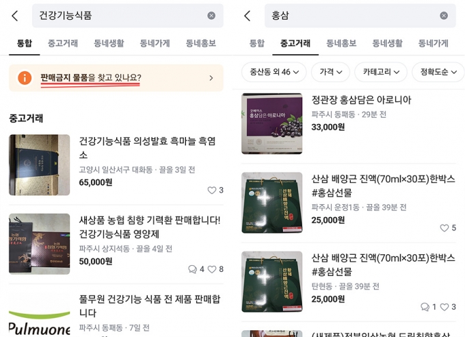 하지만 이를 제대로 인지하지 못한 중고거래 플랫폼 이용자 사이에선 건강기능식품도 선물세트와 마찬가지로 활발히 거래되고 있는 상황이다. 주로 홍삼, 유산균, 비타민 등이 거래되고 있다.