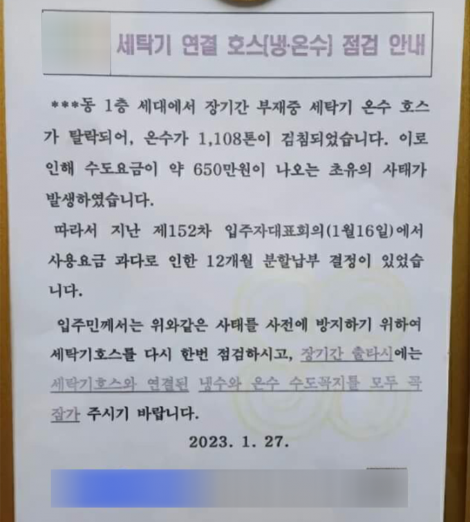 지난달 27일 해당 아파트 관리사무소장 명의로 게재된 이 안내문에는 "***동 1층 세대에서 장기간 부재중 세탁기 온수 호스가 탈락되어, 온수 1108톤이 검침됐다"며 "이로 인해 수도 요금이 약 650만원이 나오는 사태가 발생했다"고 적혀 있다.