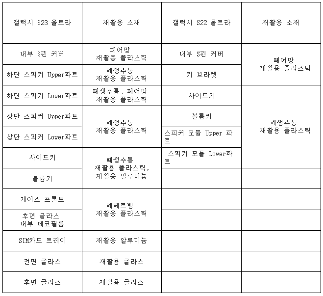 '갤럭시S23' 시리즈는 전작보다 더 많은 재활용 소재가 쓰였다. 울트라 기종은 전작보다 2배 늘어난 총 12종의 재활용 소재가 사용됐고, S23플러스와 S23 기종은 11개의 재활용 소재가 사용됐다. 전작에서 사용했던 폐어망∙폐생수통을 재활용한 플라스틱뿐만 아니라 폐페트(PET)병을 재활용한 플라스틱 그리고 공정과정에서 부산물로 배출된 알루미늄과 깨진유리로 재활용한 소재가 이번에 처음 활용됐다.
