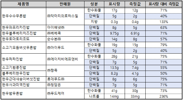 이에 '식품등의 표시기준'은 탄소화물, 단백질의 실제 측정값은 표시량의 80% 이상, 지방과 나트륨의 실제 측정값은 표시량의 120% 미만으로 정하고 있다. 하지만 소비자원 조사 결과 11개 제품(45.8%)이 영양성분 함량 표시기준을 위반한 것으로 드러났다.