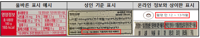 또 아이의 성장단계에 맞춰 균형 있게 영양을 공급하기 위해서는 대상 연령과 관련된 표시사항이 중요하다. 그런데 소비자원 조사 결과 온라인 판매페이지(12-13개월)와 제품에 표시(6-11개월)된 대상 연령이 다르거나 성인의 1일 영양성분 기준치를 적용해 영양성분을 표시하는 연령 표시사항에 개선이 필요한 제품은 15개(62.5%)에 달했다.