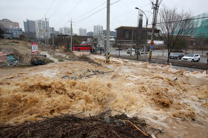 사상 최악의 가뭄으로 물부족에 시달리고 있는 전라남도 광주에서 아까운 수돗물이 도로 흘러넘치는 안타까운 일이 발생했다.