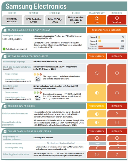 삼성전자는 지난해 2050 탄소중립 선언과 RE100 가입 등 대대적인 신환경경영전략을 선언한 바 있다. 하지만 삼성전자의 2050년 탄소중립 선언에는 온실가스 직접 배출인 스코프1과 전력 사용 등을 통한 간접 배출인 스코프2만 포함돼 있다. 이는 2019년 기준 삼성전자 연간 총배출량의 20%에 불과한 수준이라고 보고서는 지적했다.