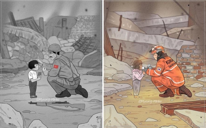 이 두 장의 그림은 각각 흑백과 컬러로 표현돼 70년 전 한국 전쟁 당시에 튀르키예가 한국을 위해 싸웠고, 오늘날 한국이 이번 구조 활동을 통해 은혜를 갚는다는 의미로 해석된다.