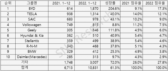 2022년 중국의 전체 전기자동차 판매량은 전년 대비 97.1% 성장한 656만대다. 반면 유럽과 북미 지역은 각각 11.2%, 49.8%에 그쳤다. 중국 업체 2곳을 제외한 상위 10개 업체의 점유율은 하락했다. SNE리서치는 "중국 내수 시장 영향으로 상위 10개 회사 가운데 중국계인 비야디와 지리차 성장률만 세 자릿수를 기록했다"고 설명했다.