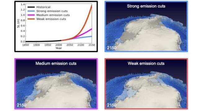 연구팀은 개발한 모델로 기후 변화에 관한 정부 간 협의체(IPCC) 6차 보고서에서 제시한 3가지 이산화탄소 배출 시나리오에 따른 남극 빙상 및 해수면 변화를 분석했다.