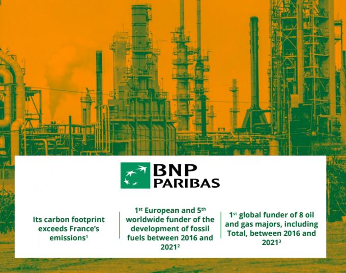 BNP파리바는 유럽 시중은행 가운데 화석연료 산업에 대출한 금액 규모가 가장 크다. 전세계로 따지면 5번째다. 활발한 해외 화석연료 개발사업 투자로 BNP파리바의 탄소발자국은 프랑스 전체의 탄소발자국을 넘어섰다.