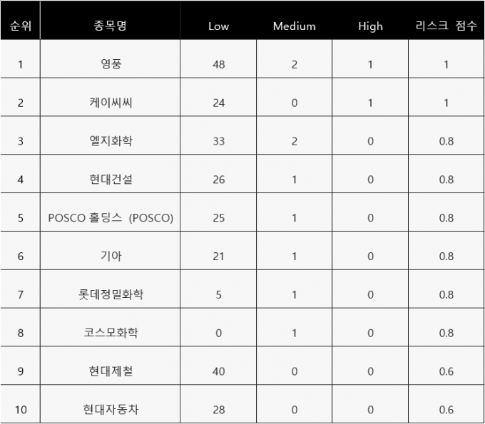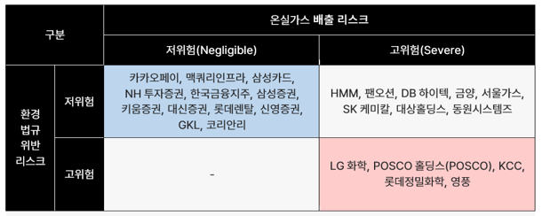 '온실가스 배출 리스크'와 '환경 법규 위반 리스크' 모두 고위험군에 속한 기업은 LG화학, POSCO홀딩스, KCC, 롯데정밀화학, 영풍 총 5곳이었다. 서스틴베스트는해당 기업들은 기후변화 전환 리스크가 매우 높으며 향후 기후변화 관련 비용이 크게 증가할 것으로 평가했다.
