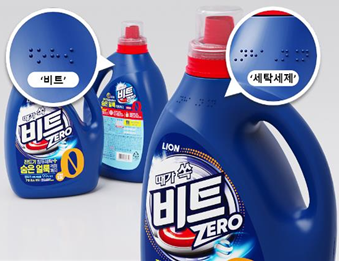라이온코리아는 액체 세탁세제 '비트' 3ℓ 용기형 제품군 10여종에 점자 표기를 우선 도입했다. 제품 뚜껑 바로 밑 앞면에 품목(세탁세제)을, 뒷면에는 제품명(비트)을 점자로 표시했다. 올 하반기에는 비트 파우치형 제품과 손세정제 '아이 깨끗해' 등으로 점자 표시를 순차적으로 확대할 예정이다.