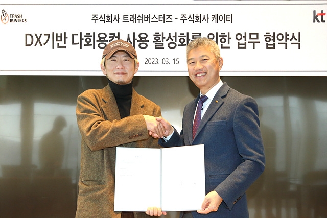 KT와 일회용품 대체서비스 기업 트래쉬버스터즈가 다회용컵 활성화와 '다회용컵 무인회수 솔루션' 개발에 협력하기로 했다고 16일 밝혔다.