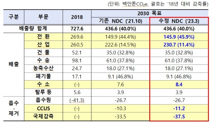 수소 부문은 2030년까지 수소차 보급률이 30만대로 늘어나는 등 블루수소 증가로 배출량이 일부 증가할 것으로 예상해 배출량을 760만톤에서 840만톤으로 목표를 조정했다. 반면 탄소포집·저장·활용(CCUS) 부문은 국내 탄소저장소 확대 등을 통해 온실가스 흡수량을 증가시킬 수 있다는 점을 반영해 기존 1030만톤 흡수에서 1120만톤 흡수로 상향 조정했다.