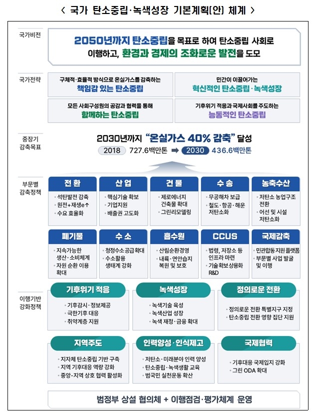 정부안에 대한 대국민 공청회는 오는 3월 22일 오후 2시 서울 강남구 한국과학기술회관에서 개최한다. 이 기본계획안은 지난해 8월부터 국책연구기관 전문가 등으로 구성된 기술작업반의 총 80회 회의와 연구・분석을 토대로 환경부, 산업부, 국토부, 과기정통부, 기재부 등 20개 관계부처의 협의를 거쳐 마련됐으며, 이후 11월부터 주요 배출 업종 관계자, 학계, 협·단체, 지자체 등 각계각층의 이해관계자를 대상으로 총 20회의 의견수렴도 진행했다.