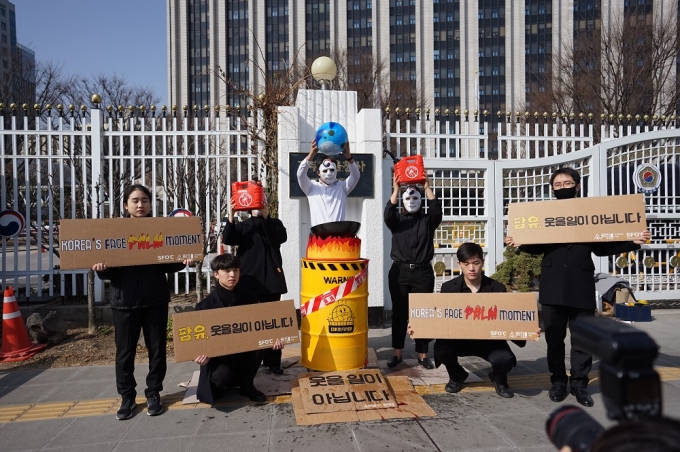 기후솔루션 회원들은 21일 오전 서울 종로구 정부서울청사 앞에서 팜유 사용중단과 관련 정책마련을 촉구하는 기자회견을 열고 팜유가 지구를 뜨겁게 하고 있다는 의미를 담긴 퍼포먼스를 진행했다.