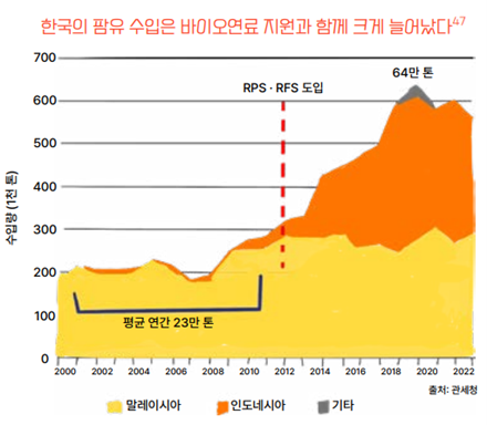 기후솔루션은 보고서를 통해 2012년부터 팜유 수입이 증가한 원인이 기업이 친환경을 빌미로 바이오연료 사용을 확대하고 있고, 정부가 이를 용인해준 것을 원인으로 분석했다. 실제로 바이오연료용 인도네시아산 팜유 수입량은 10배 증가했다. 팜유가 산림파괴·인권침해를 일으킨다는 사실이 알려진 후에도 정부는 2020년까지 기업들에게 총 800억원 이상의 팜유 융자를 지원해왔다.
