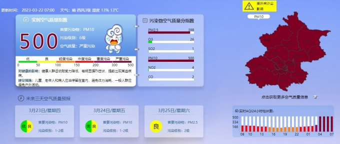 또 중국의 공기질지수는 수치로 표현 가능한 최고 수준이 500㎍/㎥인데, 센터는 이날 오전 베이징의 평균 공기질지수가 500㎍/㎥라고 밝혔다. 이에 베이징시 기상대는 이날 오전 황사 황색경보를 발령했다.