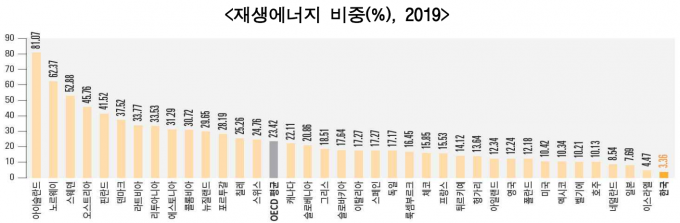 우리나라 재생에너지 사용 비중이 경제협력개발기구(OECD) 회원국 가운데 가장 낮은 것으로 나타났다.