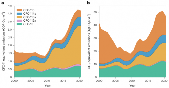 영국 브리스톨대학교 루크 웨스턴 박사 연구팀이 2010년~2020년까지 전세계 기상관측소 14곳에서 CFC-112a, CFC-113, CFC-113a, CFC-114a, CFC-115 등 5종류의 염화불화탄소(CFC) 농도변화를 측정한 결과, 배출량이 매년 늘어난 것으로 파악됐다. 흔히 프레온가스로 알려진 이들 CFC 5종의 배출량은 2020년 역대 최고치를 기록한 것으로 밝혀졌다.