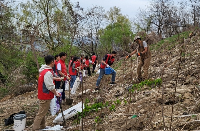 LG유플러스 임직원이 식목일을 맞아 직접 키운 도토리나무 500그루를 서울 상암동 노을공원에 옮겨심었다.