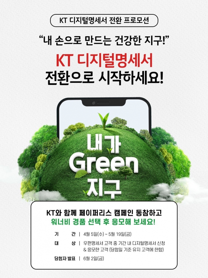 KT는 우편명세서를 이용하는 KT 고객이 5월 19일까지 우편명세서를 모바일명세서, 이메일명세서, kt.com웹명세서, 모바일통지명세서 등의 디지털명세서로 전환하고 KT홈페이지에 응모하면 다양한 경품을 제공하는 이벤트를 연다고 5일 밝혔다.