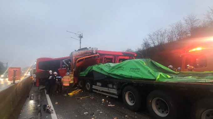 경기 여주시를 지나는 중부내륙고속도로에서 관광버스가 3㎞가량 역주행한 끝에 화물차 3대와 충돌하는 사고가 발생했다.