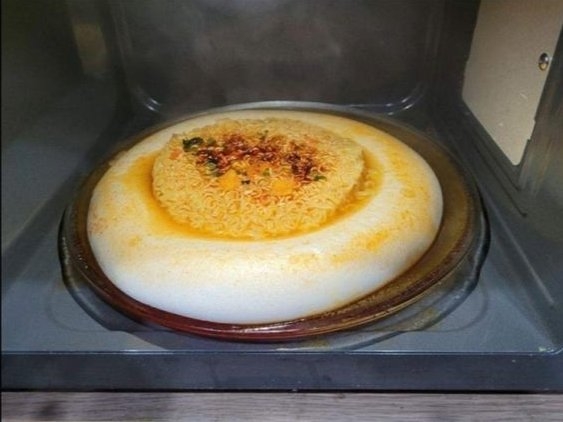 "왕뚜껑 전자레인지에 조리했는데 그릇이 뒤집혔다..."