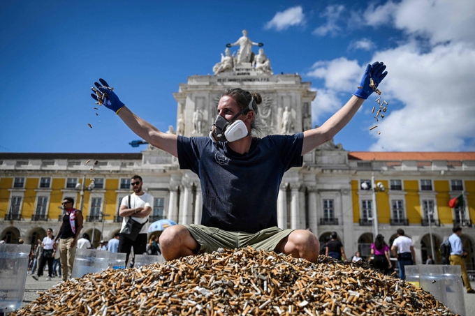23일(현지시간) AFP통신에 따르면 포르투칼 리스본 광장에서 환경운동가들은 1주일동안 길거리에서 주운 담배꽁초 65만개를 쌓아놓고 이같은 캠페인을 진행했다. 주운 담배꽁초는 플라스틱 양동이 40개를 가득 채울 수 있는 분량이었다.