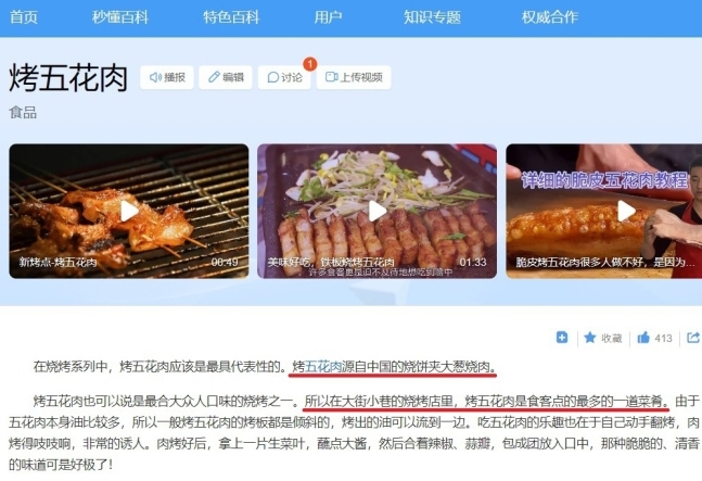 이같은 황당한 주장은 중국 누리꾼들 사이에서만 일어나는 일이 아니다. 중국 최대 포털사이트 바이두(百度)의 백과사전에는 김치와 삼계탕에 이어 삼겹살이 중국의 요리라고 표기돼있다. 바이두에 삼겹살을 검색하면 삼겹살 구이가 중국 전병에 싸 먹는 대파 돼지고기볶음에서 유래했다고 나온다.