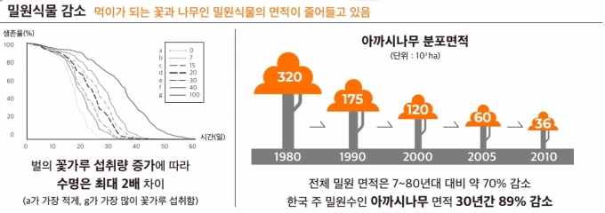 특히 우리나라처럼 천연꿀 생산의 70%를 '아까시나무'에 의존하는 등 밀원식물 종류가 한정적인 경우에는 이상기후로 꿀벌이 꿀을 모을 시기를 놓치면 1년동안 사료로만 버텨야 할 수도 있는 것이다. 밀원식물이 줄어드는 반면 꿀벌 사육봉군 밀도는 더 높아졌다. 우리나라 사육봉군 밀도는 1평방킬로미터(㎢)당 21.8봉군으로 전세계 1위다. 그만큼 먹이 경쟁이 치열해져 영양분 확보가 어려워지고, 이는 집단폐사 현상을 더 촉진하는 결과로 이어지고 있다는 것이다.