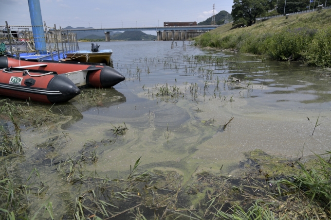 대구환경운동연합은 지난 24일 대구 낙동강 합천창녕보(이하 합천보) 상류 우산리 어부선착장에서 선명한 녹조띠가 처음 목격됐다고 25일 밝혔다. 창녕함안보(이하 함안보) 상류 선착장에서도 녹조띠가 목격됐다. 이는 지난해 녹조띠가 첫 목격된 시기보다 한달이나 앞당겨진 것이다. 지난해 낙동강에서 첫 녹조띠가 목격된 때는 6월 19일이었다.