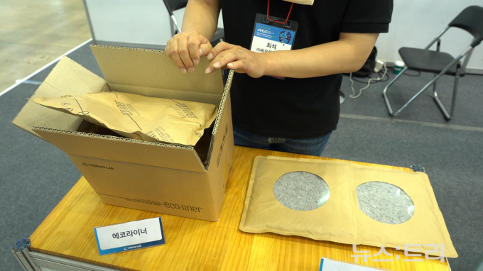 폐신문, 폐박스 등 폐지를 가공해 만든 친환경 단열재도 선보였다. 써모랩코리아의 '에코라이너'는 버려진 신문, 택배 박스와 같은 폐종이를 가공해 만든 종이단열재다.
