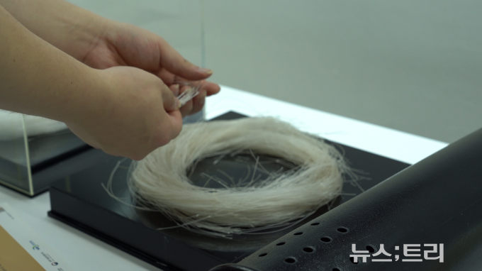 전시돼 있는 나일론 소재 그물과 생분해 그물을 직접 만져보니 촉감의 차이가 있었다. 생분해 그물이 내구성이 떨어지는 것 아니냐는 질문에 "어획성능 시험에서 나일론 그물과 동등한 성능을 보였으며 강도나 신장률도 기존 그물실의 95%까지 근접했다"면서 "오히려 해양생태계 오염이 감소하면서 어획량이 5~10%가량 늘기도 했다"라고 답했다.