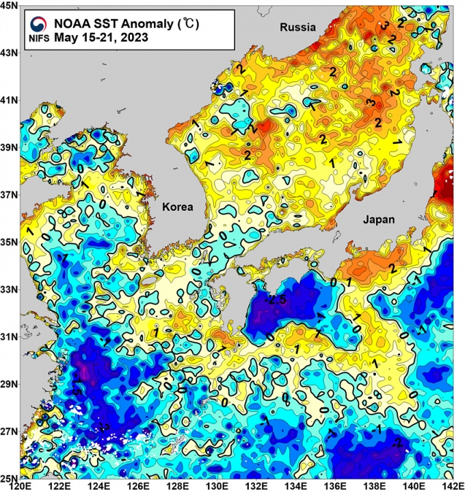 이미 올들어 우리나라 해역의 수온은 평년보다 1~3℃ 높은 수준을 보이고 있는 상태다. 5월말 현재도 평년대비 1~2℃ 높은 경향을 보이고 있다.