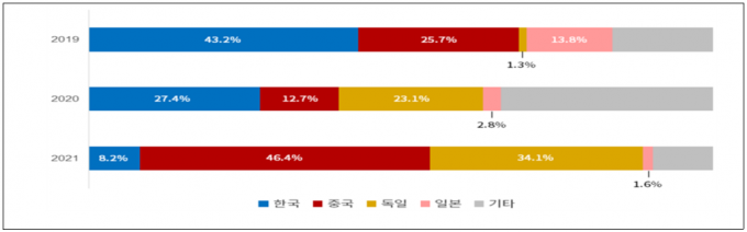 반면 중국은 태국시장에서 독일의 선전에 밀려 점유율이 일부 하락했지만(64.3% → 52.4%) 판매액은 2배 이상 늘었다. 싱가포르에서도 중국 점유율이 4.1%(3위)에서 79.5%(1위)로 급성장하며 한국을 추월했다. 독일은 말레이시아(13.8% → 83%)와 태국(0.2% → 35.6%), 싱가포르, 인도네시아 모두에서 점유율을 높였다.