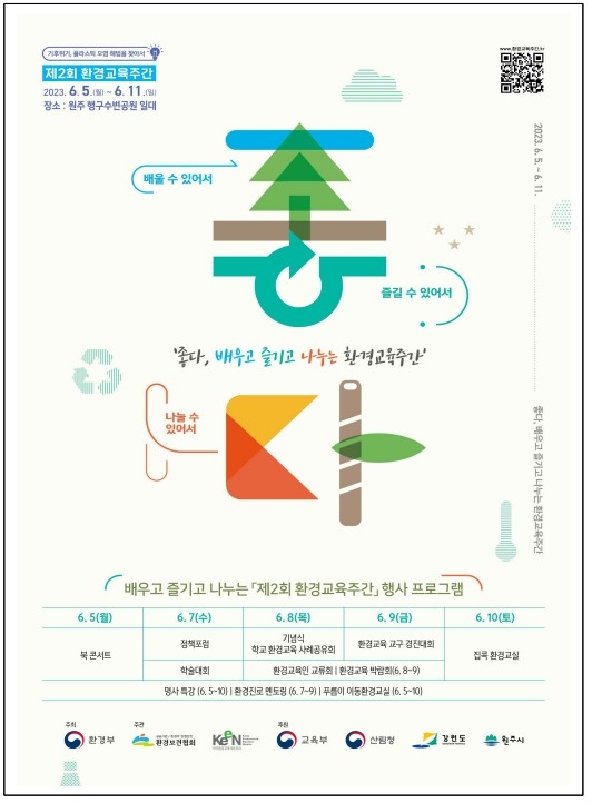 8~9일 양일동안 원주시 행구수변공원 일대에서 환경교육주간 기념식과 함께 환경교육 박람회가 개최된다. 8일에는 학교교육 사례공유회, 8~9일에는 환경교육인 교류회 등의 대한민국 환경교육 한마당 행사가 진행된다.