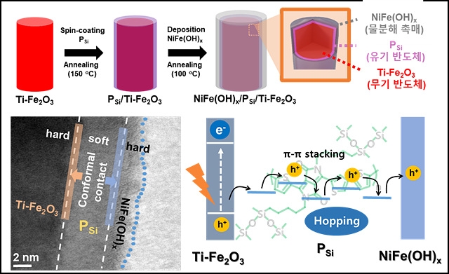 이에 연구팀은 유기반도체를 물속에서 안정적으로 사용하기 위해 기존 광전극으로 활용되던 산화철 광전극 표면에 유기반도체를 코팅했다. 코팅된 유기반도체의 표면에 다시한번 촉매(니켈·철 이중 층 수산화물)를 코팅시켜 유기반도체가 물과 직접 접촉하는 것을 방지했다. 이런 방법을 통해 태양에너지를 흡수해 생성된 전하들이 수소생산반응을 도울 수 있는 역할을 할 수 있도록 광전극을 제조했다.