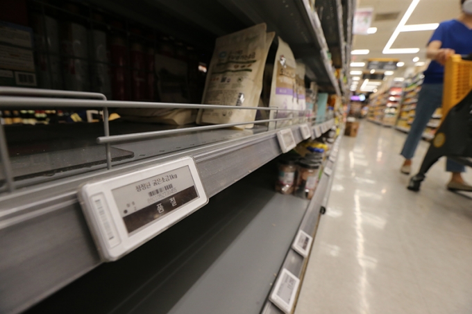 연합뉴스 보도에 따르면, 14일 오전 대전 서구 둔산동 한 대형마트의 소금 진열대는 꽃소금과 맛소금을 제외하면 텅텅 비었고 가격표에는 '품절'이라고 적혀있다.