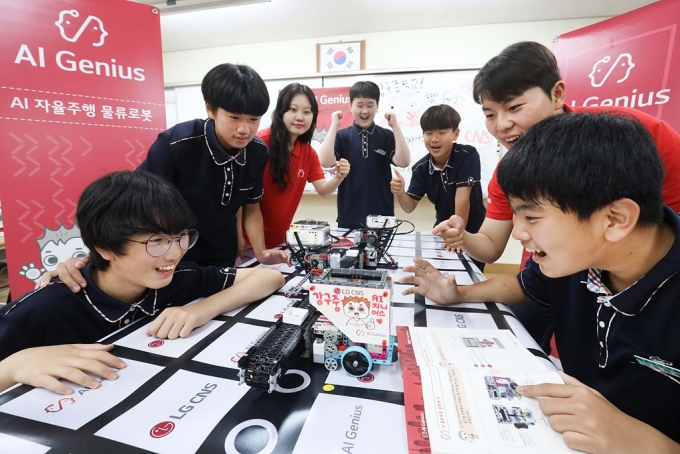 LG CNS는 지난 14일 경북 영덕에 위치한 강구중학교를 찾아가 'AI지니어스'를 진행했다고 16일 밝혔다. 이날은 강구중학교, 병곡중학교 학생 약 60명이 함께 프로그램에 참여했다. 학생들은 6시간의 정규 수업시간 동안 △AI 물류로봇 △AI 챗봇 △마이데이터 등 DX 신기술에 대해 배우고, 이를 응용해 서비스를 직접 만들었다.