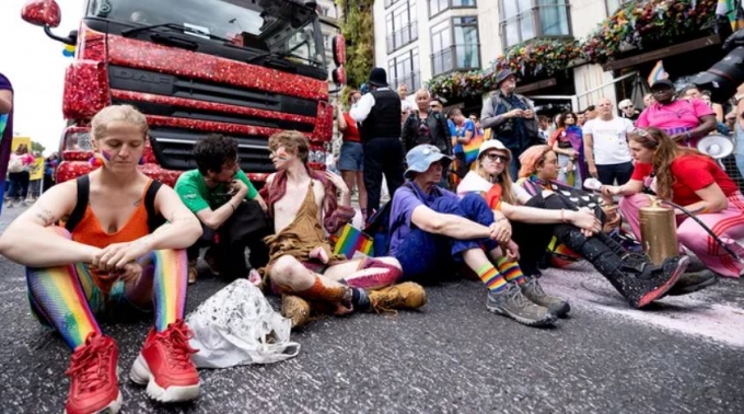 기후위기 활동가들이 런던 프라이드 퍼레이드(London’s Pride Parade)가 '핑크워싱의 장'이라며 행진을 막아세웠다.