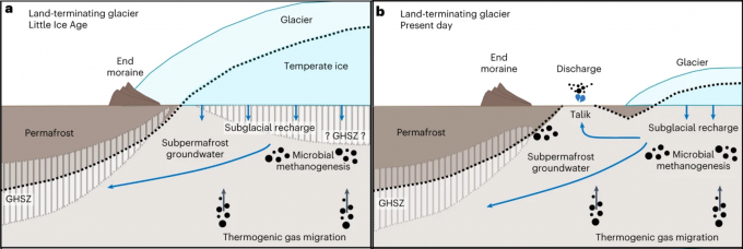 결국 드러난 탈리크 위로 빙하와 영구동토층 아래 수백만년간 잠들어 있던 메탄이 용천수로 뿜어져나오고 있다는 게 연구팀의 설명이다. 압력이 약해진 틈을 타고 메탄과 지하수가 한꺼번에 땅을 뚫고 쏟아져나오는 것이다.