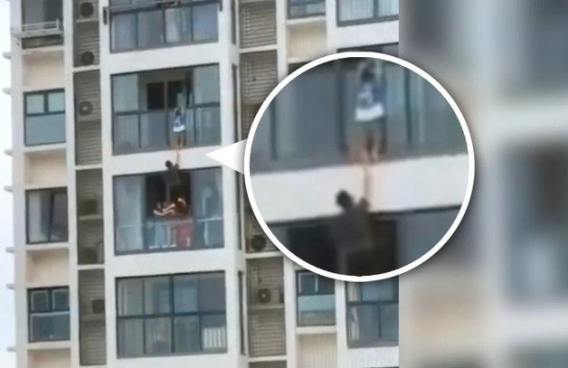 중국에서 한 남성이 아파트 베란다 난간에 매달린 아이를 무사히 구조한 사연이 화제다.