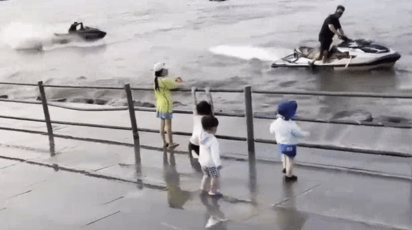 부모의 말에 아이는 어린이들이 서 있는 난간으로 다가섰고, 때마침 한 제트스키 운전자가 아이들을 쳐다보더니 차체를 돌려 모터가 아이들 쪽으로 향하게 하고선 물대포를 쏘며 출발했다. 이 물대포에 네닷살쯤 되는 아이는 그대로 뒤로 날아갔다.