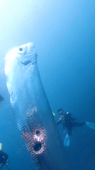 영상에는 약 11m 길이의 거대한 은빛 물고기가 유연한 몸짓으로 물속을 유영하는 모습이 찍혀있다. 눈알이 사람 얼굴만한 이 물고기의 정체는 '산갈치'(oarfish). 수심 198~1006m 심해에서 주로 서식하기 때문에 실제 마주치는 일은 거의 드물다. 종종 해안에 떠밀려 올라와 사람들에게 발견되는 정도다. 심해어가 해안으로 떠밀려 오면 대지진이 일어난다는 속설 때문에 지진의 징조라고 여겨 '지진 물고기'라고도 불린다.