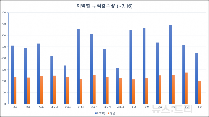 올해 장맛비는 지역별 강수량 편차도 심했다는 것이 특징이다. 비가 가장 많이 내린 지역은 654㎜가 쏟아진 충청이다. 특히 군산은 712㎜가 내렸다. 호남은 614㎜, 영남은 481㎜로 그 뒤를 이었다. 수도권은 420㎜, 강원 지역은 336㎜를 기록했다.