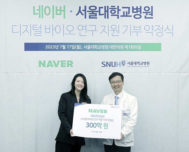 네이버가 디지털 바이오 분야 연구지원을 위해 서울대학교병원에 3년간 300억원을 기부한다. 이는 서울대학교병원 기부사상 단일 연구 지원기금 기부액 가운데 가장 큰 규모다.