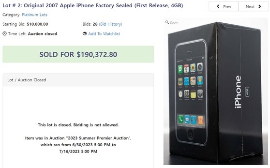17일(현지시간) 경매전문사이트 LGC옥션에 따르면 지난 16일 '아이폰 1세대 4GB 모델'이 19만달러(약 2억4000만원)에 최종 낙찰됐다.