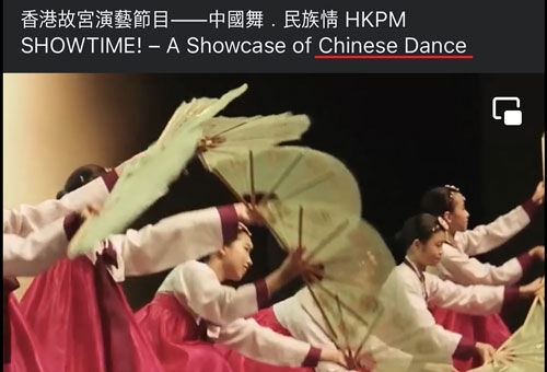 홍콩 고궁박물관이 한국 전통무용인 부채춤을 중국무용이라고 소개한 사실이 알려지며 논란이다.
