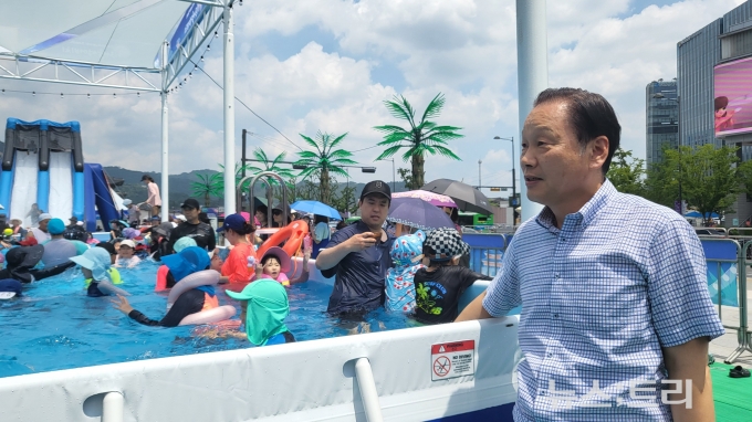 이렇게 많은 물을 광장 한가운데에 어떻게 끌어올 수 있었을까. 답은 매우 가까이에 있었다. 길기연 대표는 "광장 바로 밑에 지하수가 흐르고 있어 수도 공급이 수월했다"고 답했다. 또 지하수 특성상 물순환이 지속적으로 이뤄져 수질관리도 원활하다는 설명이다. 물놀이장의 수질검사는 하루 4회 진행되고 있다.